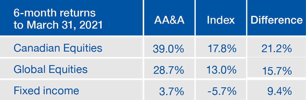 The markets have seen a marked shift in favorable investment styles over the last six months. Since October 1, 2020 global value stock indices have performed better than growth stocks indices (19.3% vs. 6.1% in CAD) overall. Our strategies are well aligned with this shift and have significantly outperformed over the past half-year.