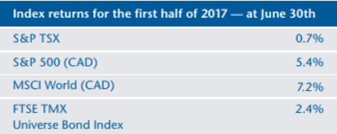 On the fixed income side, bonds started the year strong although the tide turned in the second quarter. Nonetheless, overall the Canadian bond market returned a respectable 2.4% in the first half of 2017.