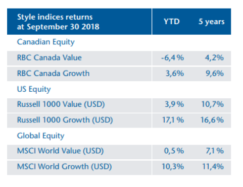 In Canada this year, more than half of the sectors posted negative returns. The health care and information technology sectors were by far the best performers in the first nine months of the year. Marijuana stocks whose valuations are almost entirely dependent on growth expectations were responsible for health care’s outperformance. It was also strong growth expectations that propelled some of the stocks in the information technology sector.