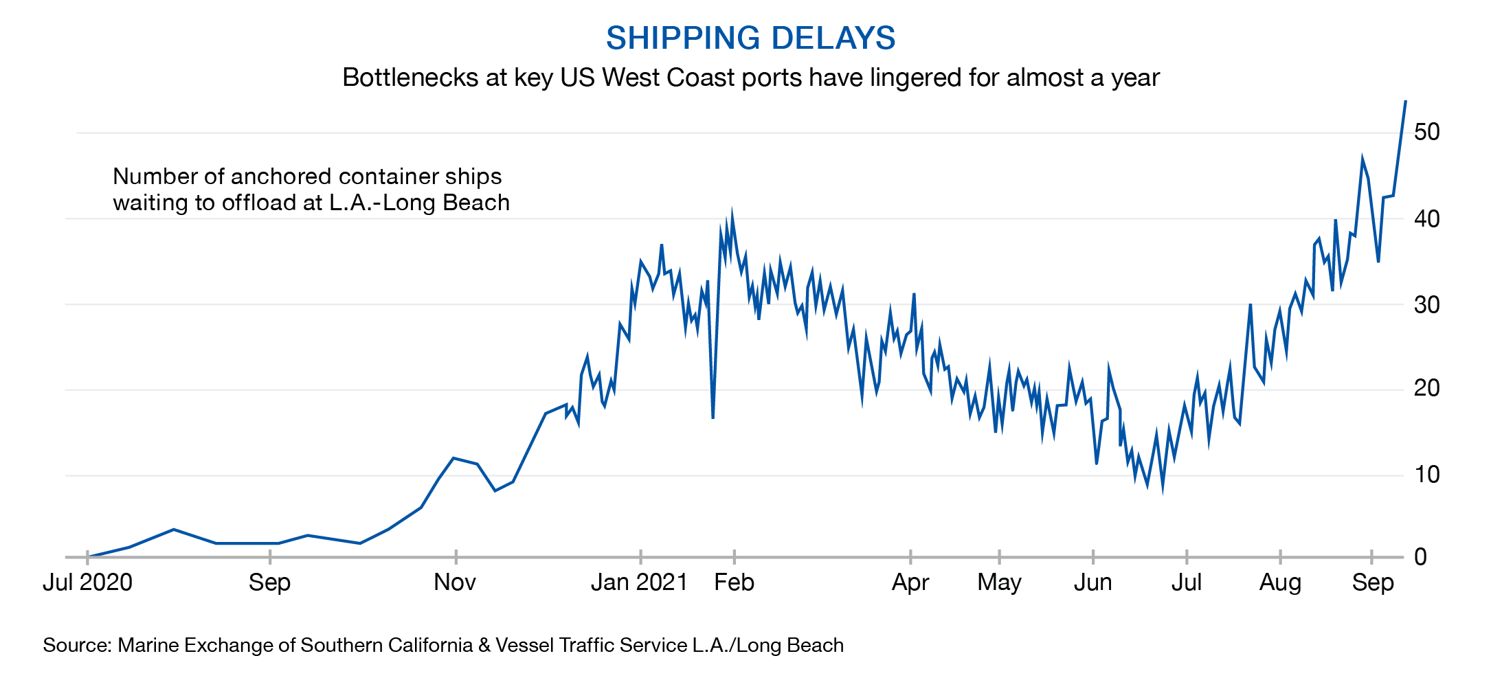 The largest disruption has been within the logistics sector, involved in moving goods all along the supply chain. From ports to rail yards, global supply lines struggle amid the virus outbreak, forcing factory shutdowns, in the developing world. Container shipping rates from China to the United States have scaled to fresh highs above $20,000 per 40-foot box, up over 500% from a year prior, and, as the graph below shows, delays at the Port of Los Angeles have reached over 8.5 days, with over 55 ships idled offshore.