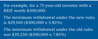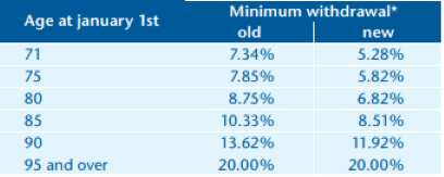 Minimum RRIF withdrawals were lowered to reflect the longer life expectancy of retirees. If you systematically withdraw the prescribed minimum from your RRIF, in 2016 you will therefore receive a smaller amount than in previous years (see table below).