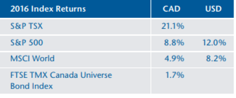 Very few predicted that the United Kingdom would vote in favour of leaving the European Union (Brexit) or that Donald Trump would become the US president. Needless to say, such predictions would have been accompanied by gloomy forecasts for stock markets. Yet stock market returns were quite strong in 2016. The Canadian market (21.1%) performed better than the US market (8.8% in CAD) for the first time in six years. The loonie appreciated slightly against the greenback (3.0%).