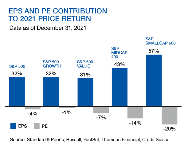 As surprising as it may seem, earnings growth was the main contributor to 2021 stock returns. For the US market, earnings increased by 32% last year while valuation multiples contracted by 4%.