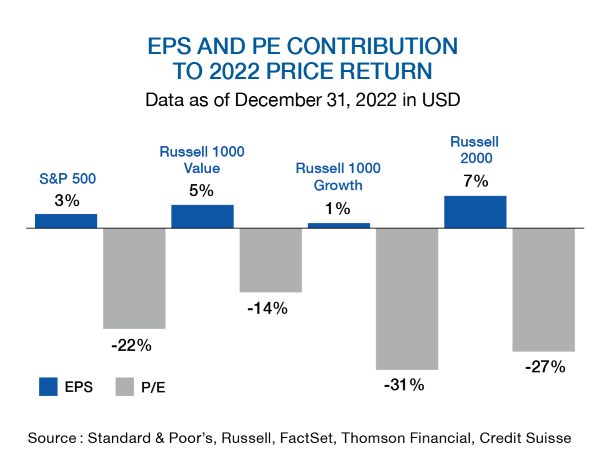 Yet, despite disappointing stock market returns (see table above), overall publicly listed companies achieved respectable financial results during the year - successfully increasing their earnings per share (EPS) by around 3%. In summary, the story of 2022 is one of contracting valuation multiples (price-to-earnings ratio) due to investors’ fears of inflation, interest rates and the depth of a possible recession. In the next chart, multiples also show a deeper contraction of multiples for growth stocks (-31% for the Russell 1000 Growth Index) than for value stocks (-14% for the Russell 1000 Value Index), mainly as a result of a downward revision of future growth for technology stocks.