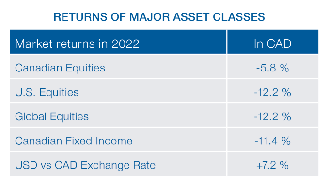 In 2022, Canadian investors fared better than just about any other investors in the world. First, our equity market benefited from its high exposure to natural resources, while Russia, also heavily exposed to these sectors, was distracted and boycotted. In addition, our foreign investments benefited from the 7.2% strengthening of the greenback against the Canadian dollar, dampening the decline.