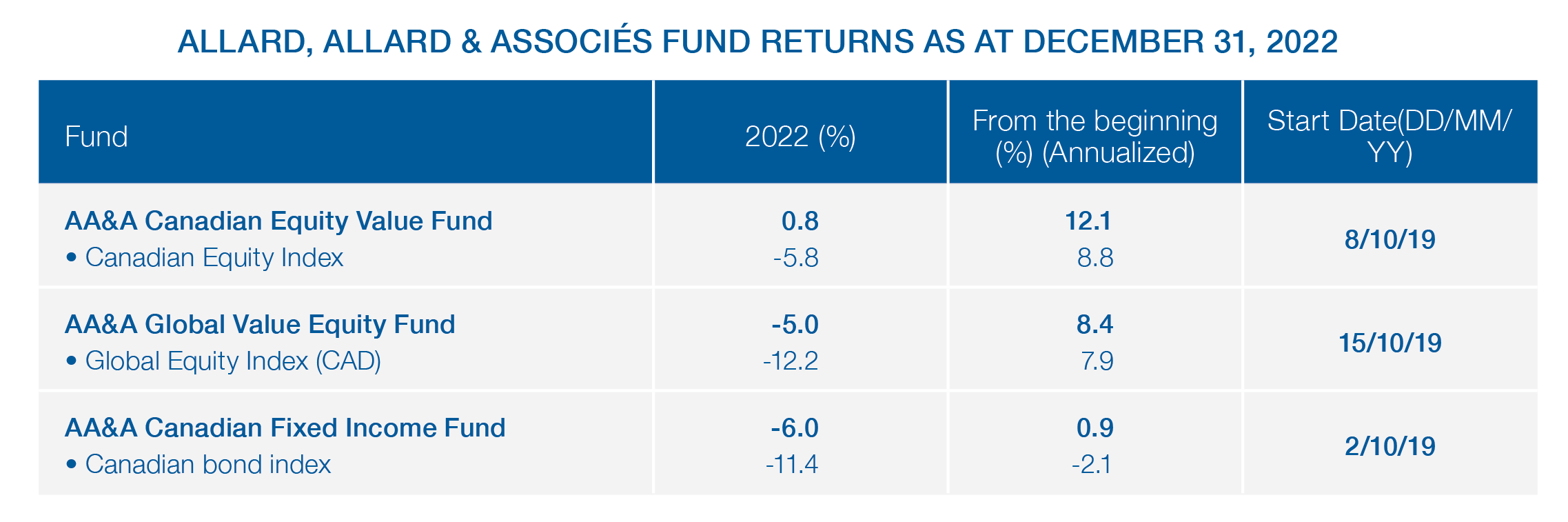 Like you, we prefer when returns are strongly positive, as was the case in 2021 when our equity strategies achieved returns in the range of 20%. In 2022, our approach continued to shine in times of adversity as all our strategies outperformed their benchmarks (see AA&A Funds performance chart below).