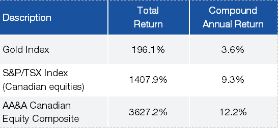 To quantify the long-term impact of this philosophy, we compared the performance of gold stocks, meaning gold mining companies, to that of the Canadian equity market and to that of our Canadian Equity Portfolio since our inception in July 1995. The following table summarizes the results. Over this period of more than 30 years, the absence of gold stocks has contributed positively to client returns.