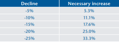One of the obvious benefits is that by better preserving value during declines you ensure that more capital will be at work to take advantage of the ensuing turnaround. Therefore better capital preservation during downturns is an effective way to improve long-term returns. The table below illustrates the positive performance required to restore a portfolio's value to its pre-decline levels.