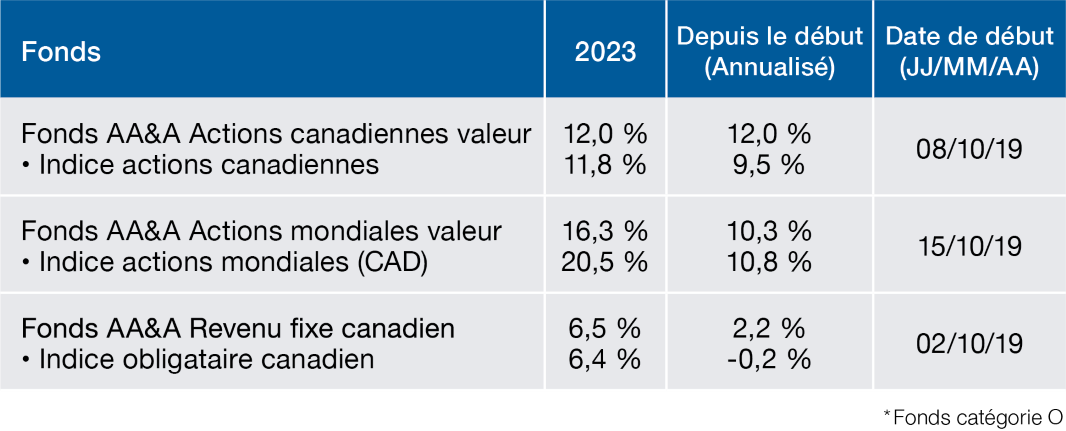L’inflation reste une source d’inquiétude pour les investisseurs, mais l’évolution des taux d’intérêt est encourageante. Les banques centrales du monde entier maintiennent ou réduisent leurs taux pour stimuler l’économie face à divers obstacles. Le Canada et l’Europe devraient afficher une croissance plus modeste au cours du premier semestre, suivie d’une reprise au second, car les hausses de taux antérieures ont pesé sur les profits des entreprises et la consommation des ménages. La situation aux États-Unis est un peu différente, car les consommateurs ont été moins affectés par les taux d’intérêt puisqu'ils ont fixé leurs emprunts hypothécaires à des niveaux très bas. Pour le marché boursier, les bénéfices devraient faire face à des défis à mesure que l’économie ralentit, mais des taux d’intérêt plus bas aident généralement le marché à surmonter cette faiblesse. Notre accent sur la qualité et notre méthode d’évaluation rigoureuse nous permettent de concilier avec succès ces deux facteurs, et nous sommes optimistes à l’égard du rendement de nos portefeuilles d’actions à long terme.