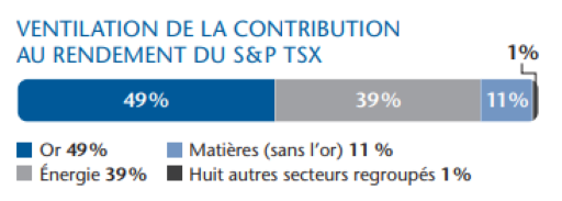 Les titres aurifères, en hausse de 94%, ont expliqué 49% du rendement de l’indice tandis que le restant du secteur des matières contribuait à 11% du rendement de l’indice. Dans l’ensemble les matières expliquaient 60% du rendement du S&P TSX (5,9% sur 9,8%);