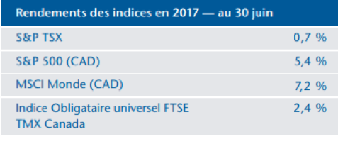 Du côté des titres à revenu fixe, les obligations avaient connu un bon début d’année et le vent a tourné au cours du 2e trimestre. Somme toute, la progression de 2,4 % du marché obligataire canadien au cours de la première moitié de 2017 est respectable.