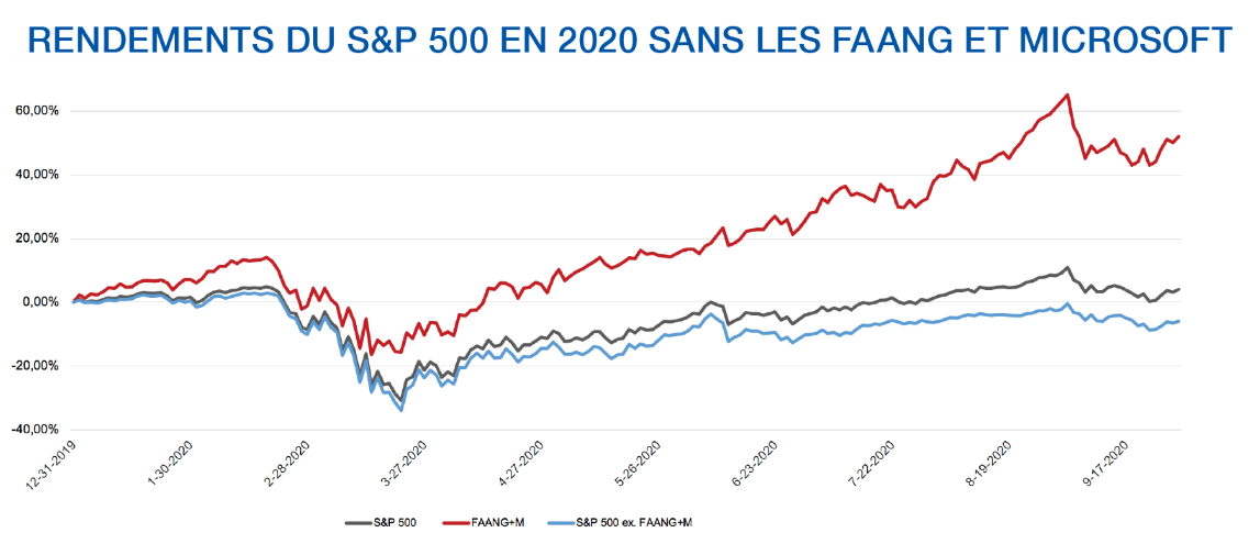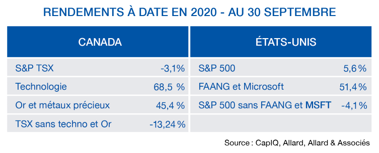 La reprise des marchés a été vigoureuse depuis les creux de mars dernier et dans l’ensemble les rendements de -3,1 % pour le marché canadien, de 5,6 % (USD) pour les actions américaines et de 4,8 % (CAD) pour les actions mondiales après trois trimestres cette année semblent raisonnables. Ce que l’histoire ne dit pas est que la grande majorité des entreprises ont une année difficile pendant qu’une infime minorité de titres embellissent les rende-ments des indices boursiers. En effet, les rendements s’empirent de l’ordre de 10 % en enlevant les titres techno-logiques et les métaux précieux du TSX et en enlevant les 6 titres technos « FAANG et Microsoft » (Facebook, Apple, Amazon, Netflix, Alphabet (Google) et Microsoft) du S&P 500. Veuillez consulter le tableau ci-dessous et le graphique à la page suivante. Nous croyons qu’un retour à une croissance économique soutenable favorisera une bonne tenue de plusieurs des titres non technologiques pour lesquels 2020 a été plus difficile. C’est d’ailleurs ce qui semble être en voie de s’opérer depuis le début du mois de septembre ce qui favorise les stratégies diversifiées moins pondérées en techno, telle que la nôtre.