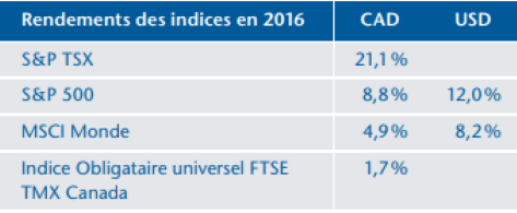 Bien malin est celui qui aurait prédit que les Britanniques seraient majoritairement en faveur de déserter l’Union européenne (Brexit) ou que Donald Trump serait élu à la présidence américaine. Des prédictions qui a priori auraient été accompagnées de sombres pronostiques pour les marchés boursiers. Pourtant les rendements boursiers auront été vigoureux en 2016. Le marché canadien (21,1%) a mieux fait que le marché américain (8,8% en CAD) pour la première fois en six ans. Le huard s’est légèrement apprécié face au billet vert (3,0%).