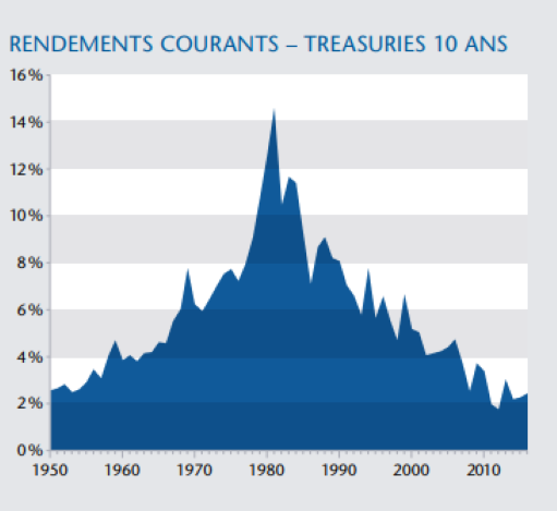 La hausse de taux qui s’entame aux États-Unis occasionnera sans contredit des rendements obligataires négatifs. Nous croyons que ce contexte pourrait être le catalyseur d’un déplacement d’actifs des obligations vers les actions. La résultante de l’accroissement de la demande pour les actions serait une expansion des multiples ou, si vous aimez mieux, des prix plus élevés pour les titres boursiers. À l’inverse, une demande moindre pour les obligations pèserait sur leurs prix. La tendance baissière des taux d’intérêt qui perdure depuis le début des années 80 et qui a engendré des rendements obligataires supérieurs aux moyennes historiques est vraisemblablement terminée.