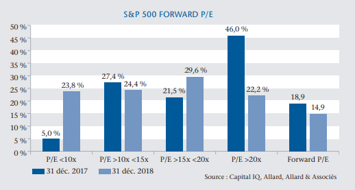 Conséquemment, il y a un plus grand nombre de titres attrayants comme le démontre le graphique ci-dessous qui compare les multiples d’évaluation et leur ventilation actuels à ceux de l’année dernière pour les titres qui composent l’indice américain (S&P 500). On remarque rapidement que la proportion de titres ayant des multiples cours/bénéfices de plus de 20 a fortement diminué au profit des titres beaucoup moins cher ayant des multiples de moins de 10.