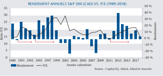 L’optimisme s’est fait damer le pion par le pessimisme sur les marchés boursiers en fin d’année 2018. La nervosité des investisseurs a notamment été accentuée par les anticipations de ralentissement de croissance économique découlant de tensions géopolitiques (guerre commerciale sino-américaine et Brexit) et d’une politique monétaire moins accommodante se traduisant par la hausse des taux directeurs. Une réévaluation des attentes de croissance future a eu un impact défavorable généralisé sur le prix des titres boursiers. C’est ainsi que 55 % des titres sur le marché américain et 58 % de ceux sur le marché canadien ont terminé l’année 2018 en recul de plus de 20 % par rapport à leur sommet.
