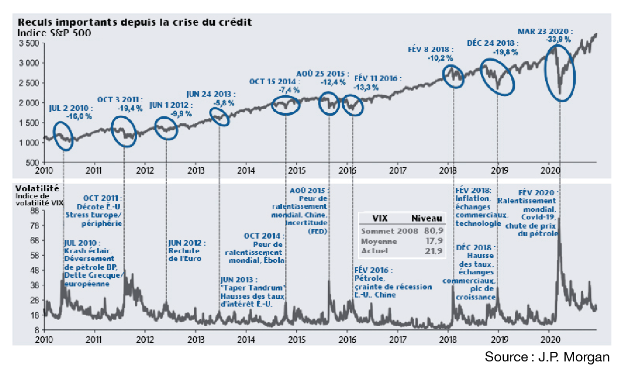 En 2020, la patience des investisseurs aura été mise à rude épreuve. Dans le point du premier trimestre nous avions expliqué l’importance de maintenir le cap lors des reculs et sur la pertinence d’investir en bourse. Cette fois encore, ceux qui ont patienté et maintenu leur stratégie ont été récompensés. La volatilité est une partie inhérente de l’investissement boursier. Un horizon de placement assez long et la capacité de patienter en période d’adversité sont des conditions nécessaires à l’appréciation de capital par l’investissement boursier. Le graphique à la page suivante illustre les reculs du marché américain (S&P 500) au cours des 10 dernières années, lors d’une période fortement haussière pour le marché américain.