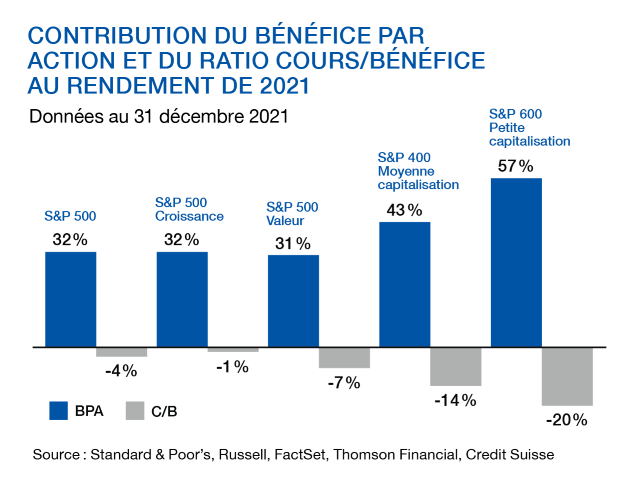 Aussi surprenant que cela puisse paraître, la croissance des bénéfices a été le principal contributeur aux rendements boursiers de 2021. Pour le marché américain, à titre d’exemple, les bénéfices ont augmenté de 32 % l’an dernier alors que les multiples de valorisation se sont contractés de 4 %.