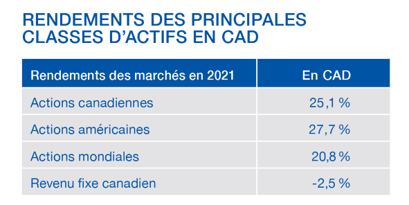 Une grande partie du rendement de 2021 s’est réellement déroulée au cours du premier trimestre. Lors du restant de l’année, les marchés ont progressé beaucoup moins rapidement.